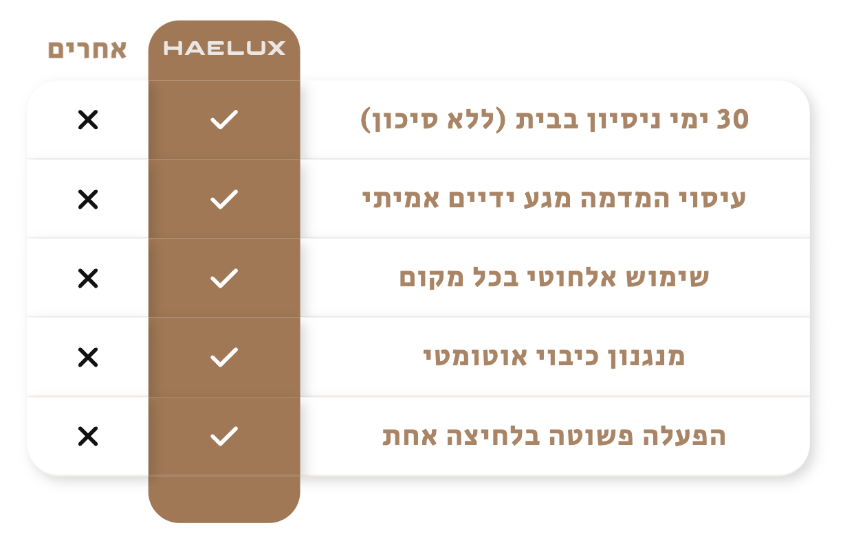 חשוב לנו שתרגישו בטוחים ב־100% ברכישה שלכם. לכן ב־HEALUX אנחנו מתחייבים לחוויית קנייה נטולת דאגות עם כל היתרונות: